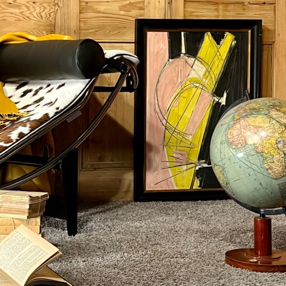 Huile sur toile , période de l’abstraction chère à Marcel Recher, lignes courbes et obliques s’entrecroisent, en juxtaposant des couleurs telles que le rose , le jaune et le noir avec quelques touches de blanc , l’œuvre est signée et datée 1965.
