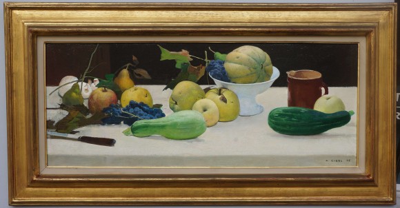 Exceptionnelle fraîcheur pour cette impressionante composition aux fruits et courges sur nappe blanche. Huile sur panneau, signée A. GIESS et datée 56 ( 1956). Beau cadre en bois doré mat.