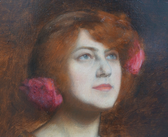 Portrait - jeune femme rousse aux yeux verts - huile sur toile - beau cadre ancien.