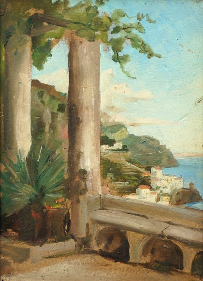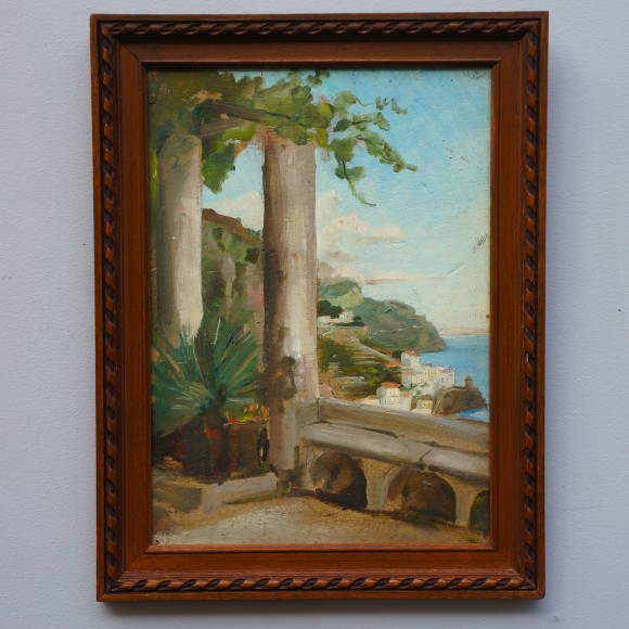 Belle ambiance méridionale pour cette petite huile sur panneau de carton fort, vue sur Amalfi de la loggia, de Many Benner annotée et datée1889 au dos. Rappelons que Many Benner, bien qu'étant un artiste français d'origine alsacienne par son père, est né à Capri, ceci expliquant son attachement à cette région d'Italie. Cette œuvre est issue de la succession de l'artiste et restée dans la famille par descendance. Beau cadre en bois naturel sculpté d'une frise.