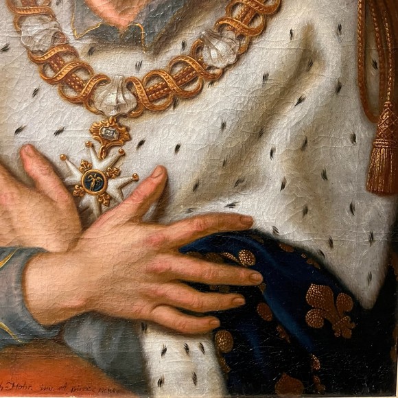 Hommage au roi Louis IX, le seul des rois français canonisé, sous le nom de Saint-Louis, il est représenté ici à côté de sa couronne. Œuvre signée par Joseph-François Hohr un des membres de la dynastie d'artistes ayant établis leur atelier à Colmar au XVIII ème . Le Musée Unterlinden possède dans ses collections des témoignages de leur travail. Ce portrait de Saint Louis est signé au bas droit et daté : Joseph FHohr inv pinx 1786 . Joseph Hohr est réputé pour ses miniatures, sa maîtrise est confirmée ici par un sens aigu du détail .Époque 18 ème siècle. Cadre moderne bois et or blanc.