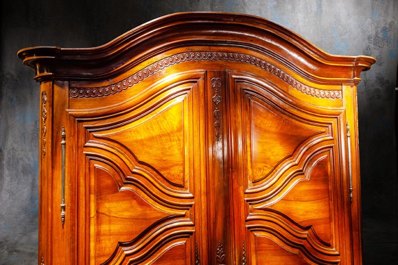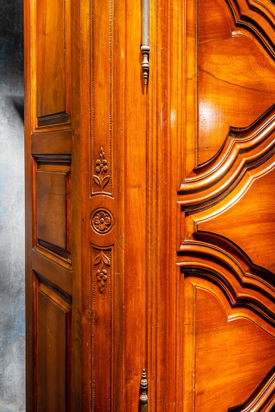 Exceptionnelle armoire en noyer avec corniche cintrée en chapeau de gendarme, portes avec mouluration rayonnante simulant les rayons du soleil, montants à pilastres, traverse et dormant avec réserves sculptées. région du vignoble , centre de l'Alsace. Belle serrure. Epoque XVIII ème.