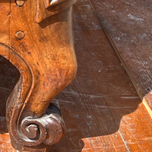 Spectaculaire armoire de chateau en noyer, région Provence Vallée du Rhône. Belle mouluration des portes en ellegie, décor chantourné. Corniche chapeau de gendarme, traverses haute et basse sculptée de rinceaux, médaillon et coquille, grand tiroir avec poignées fer d'époque . Montants sculptés d'agrafes et de rinceaux. Coté à médaillon chantourné . Pieds avec volutes en escargot, une des volutes avant partiellement restaurée. Aménagement intérieur avec une étagère comprenant 3 tiroirs qui peut se positionner plus bas. Belle serrure à double penne et crémone d'époque, clef ancienne postérieure. Très beau noyer. Époque XVIII ème . Hauteur 262 cm.