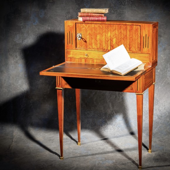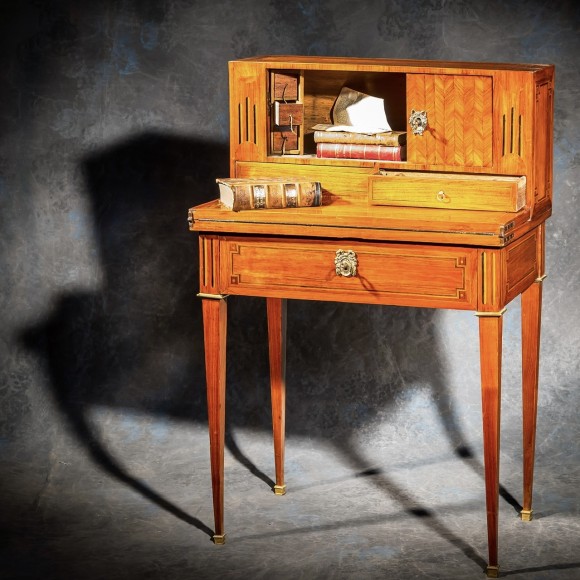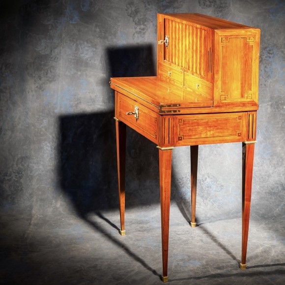 Le plateau se déplie pour être un écritoire gainé de cuir. Dans la partie inférieure un grand tiroir. Il est estampillé F.SCHEY (Fidelys Schey Maître en 1777)