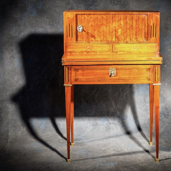 Grande finesse d’exécution pour ce charmant bonheur du jour Louis XVI en marqueterie, de bois de rose, d’amarante et de satiné, filets motifs à la grecque, cannelures simulées, forment son décor. La partie haute formant gradin est composée de deux petits tiroirs et d'un rideau coulissant derrière lequel se trouve une cachette avec deux petits tiroirs.