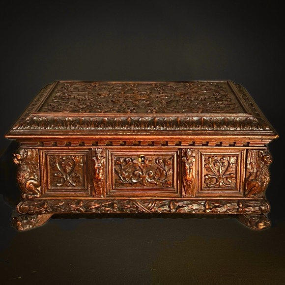 Rare coffret de courtoisie ou de mariage en noyer, Italie, XVII ème, qui utilise les éléments typiques des décors de la renaissance.
