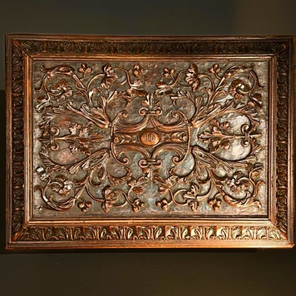 Le plateau est sculpté en son centre d’un cartouche formé de quatre cornes d’abondance au milieu duquel des initiales entrelacées :NO. L’ensemble du plateau est sculpté d’arabesques et de rinceaux feuillagés et bordé d’une moulure, également sculptée de feuilles, soulignée d’un crénelage . L’intérieur du coffret a été équipé postérieurement d’un plateau amovible, probablement pour y conserver des bijoux, et habillé d’un gainage en velours rouge, les charnières et la serrure sont postérieures. Belle patine, quelques abrasions et usures au niveau des pieds.
