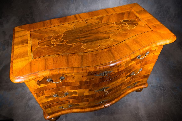 Commode alsacienne à trois rangs de tiroirs, façade galbée, plateau au bord mouluré en bois de bout et au dessus marqueté d'entrelacs cernant des réserves de noyer ronceux. Socle en bois de bout sur pieds boules, poignées tombantes en bronze. Cette jolie commode est de petite dimensions et présente de très belles proportions. Noyer , placage épais de noyer et d'érable, bâti en sapin. Alsace Epoque 18 ème.