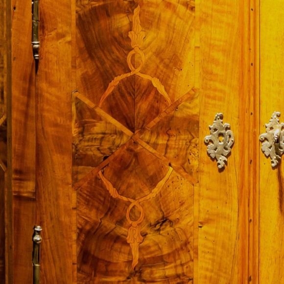 le décor des portes présente des réserves en 4 feuilles, cernées de filets ceux ci sont également repris dans les montants, avec un motif de lambrequin dont les cordons s'entrecroisent et sont finalisés des pots à feux, l'érable est l'essence utilisée pour ces motifs. Les portes sont équipées de gonds en laiton et habillées dans les angles de beaux motifs feuillagés en bronze.