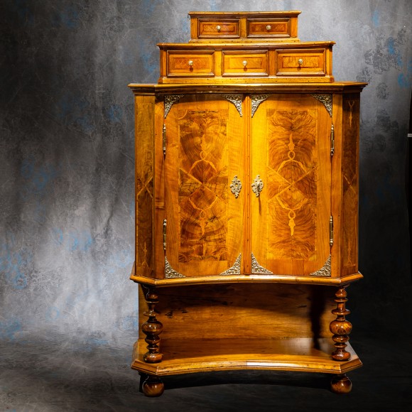 Le corps du meuble est élégant, posé sur un piètement en bois tourné dégageant un espace de présentation. La partie supérieure est surmontée d'un ensemble de 5 tiroirs disposés en gradins permettant dans les siècles passés d'y présenter des hanaps en argent, des coupes ou carafes. Les montants sont à pans coupés et accentuent l'effet de légèreté dégagé par l'ensemble. Sud de la Vallée du Rhin Alsace ou Suisse - Epoque XVIII ème siècle