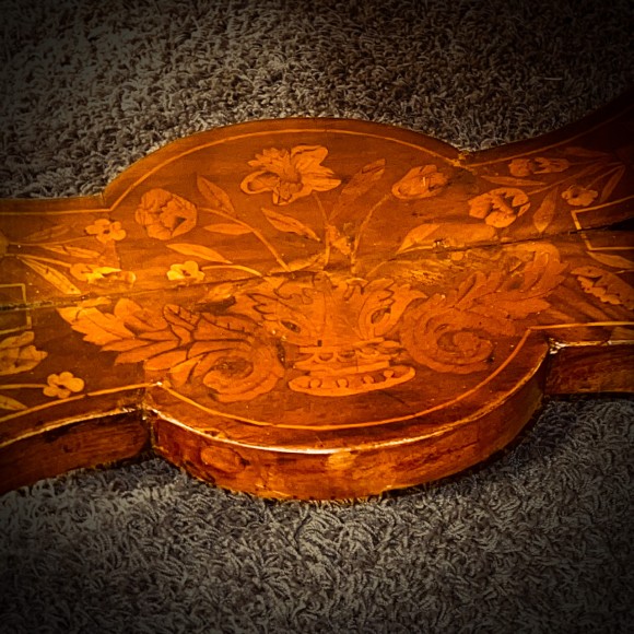 Travail de la Vallee du Rhin, probablement hollandais, vers la fin du XVIII ème ou le début du XIX eme siècle. Les bois utilisés sont l'acajou, le palissandre, l'érable et des bois fruitiers, sur un bati en chêne. Le décor est réalisé comme un tableau, avec des ombres, celles ci sont obtenues en insérant avec doigté, les bois clairs dont les bords doivent être brunis, dans du sable chaud. Belle patine.