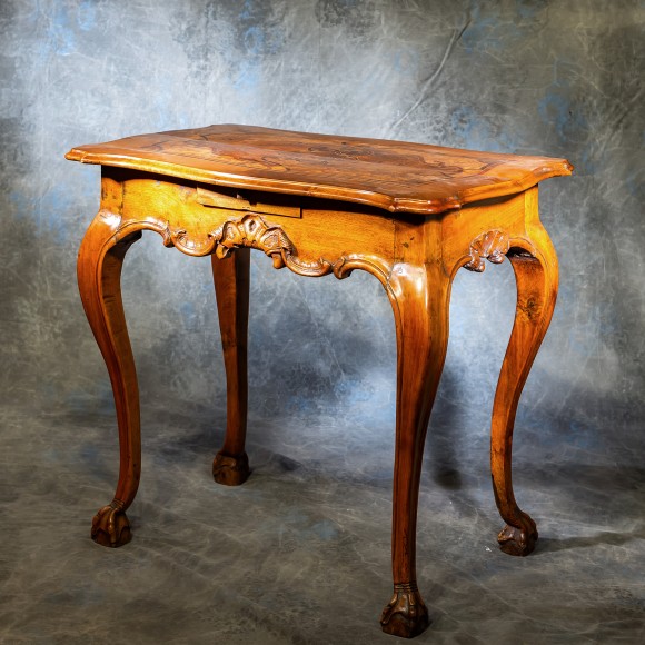 Piètement vigoureux et bien mouluré terminé par des pieds griffes enserre une sphère, les traverses de la ceinture sont sculptés d'une coquille . Le plateau aux contours chantournés et moulurés est entièrement marqueté de bois contrastés formant un décor d'entrelacs et de volutes dans des réserves de frisage de noyer . Epoque XVIII ème siècle Alsace - Suisse