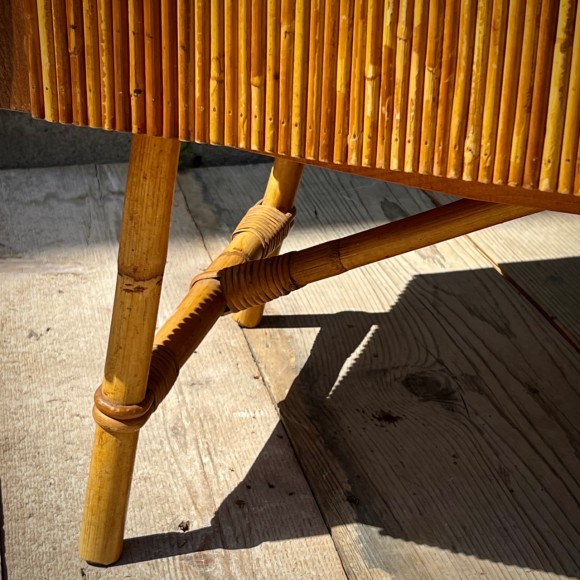 Buffet vintage, recouvert de Bambou avec insertions de céramiques, rare et sympathique modèle pour une ambiance véranda réussie. Fabrication des Années 1960.