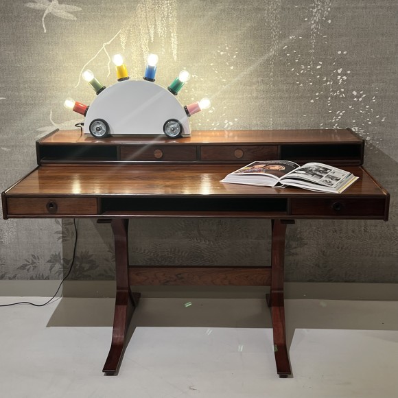 Bureau vintage design italien crée en 1957 par Gianfranco Frattini et fabriqué par les ateliers Bernini, de Milan, Italie dans les années 1960. Ce modèle était dans le catalogue de ce fabricant réputé pour la qualité de son ébénisterie sous le numéro 530. Notre bureau est à deux tiroirs et deux logements ouverts en façade avant, et deux espaces de rangement sur la face arrière, il est complété d’un gradin amovible posé sur le plateau avec deux tiroirs et deux espaces de rangement. Le piètement très original est de forme traîneau en T inversé. Il existait plusieurs variantes de ce meuble au catalogue Bernini. L’autocollant original de la marque du fabricant figure sur le côté intérieur de deux tiroirs.Les deux tiroirs latéraux de la partie bureau disposent d’une serrure, celles ci ne sont plus fonctionnelles et il manque la clef.