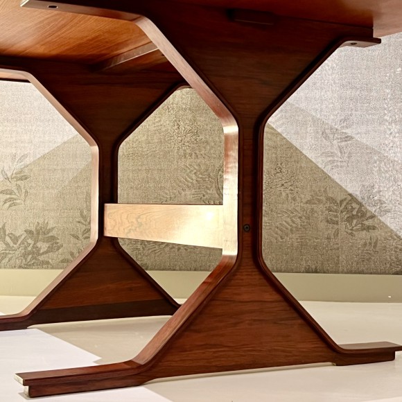 Très esthétique avec son design aérien, ce bureau est multi usages, il peut être placé contre un mur ou utilisable en milieu de pièce car il est fini sur toutes ses faces. Ce joli meuble est réalisé en ébénisterie de palissandre, il est dans une belle patine d’origine, et a bénéficié d’un polissage, il est en très bon état et présente quelques usures du temps, des petites rayures et une trace de brûlure sur un côté du plateau sont à signaler. Pièce de collection - Époque milieu du XX ème siècle.