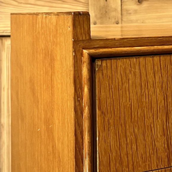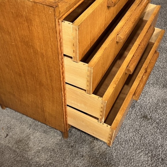 Fonctionnelle, cette commode vintage des années 1965 /70 à 4 tiroirs, peut s’intégrer dans le style brutaliste avec ses grosses poignées cylindriques . Le dessin reste sobre, soigné et recherché: à noter, la fine moulure périphérique sur la façade, les cotés qui dépassent du plateau, et la position des poignées , décentrées sur la hauteur du tiroir, les pieds sont aussi à remarquer, biseautés , dans un esprit Jean Prouvé . Meuble logeable et en bon état.