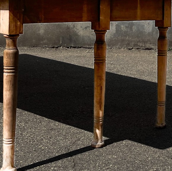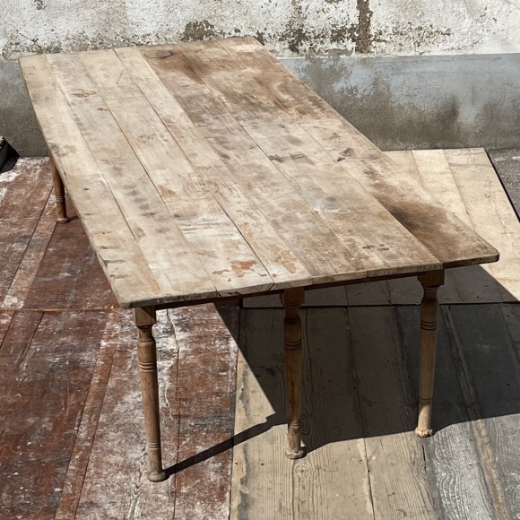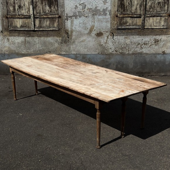 Très grande table de 3 mètres de long par 1,20 mètre de large, pour 16 convives, table de communauté, de restaurant ou de brasserie , modèle original à 6 pieds balustres, très beau plateau dans le jus, aspect délavé, avec traces d'usage et planches légèrement disjointes. Le bois est un fruitier. Des renforts sous le plateau confèrent à l'ensemble une très bonne stabilité. Le plateau étant fixé par des taquets amovibles sur la ceinture peut se désolidariser de la structure, ce qui peut faciliter le transport.