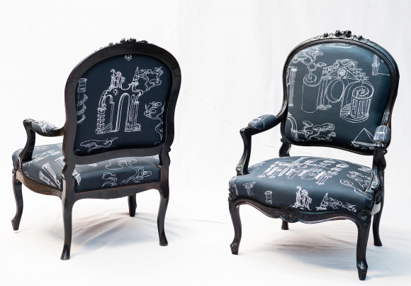 Paire de fauteuils Epoque Napoleon III, en bois sculpté de volutes et fleurs, laqués noir, recouverts d'un tissu moderne de coton imprimé noir et blanc sur le thême de l'architecture.