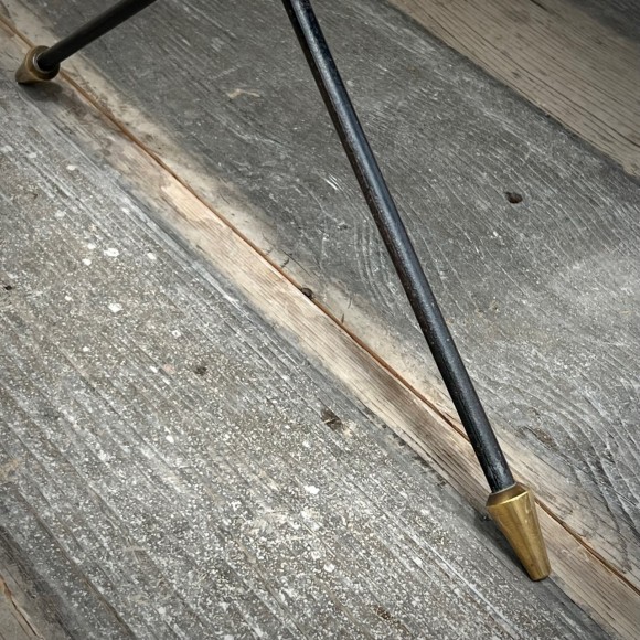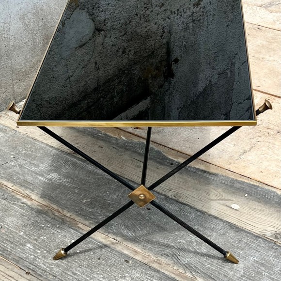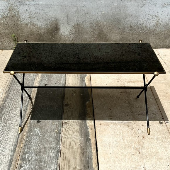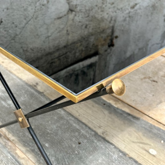 Piètement croisillon en acier avec inserts en laiton pour les raccords, les extrémités et les sabots de finition, plateau en verre laqué noir . Belles proportions et légèreté en font un design remarquable, pièce probablement issue des ateliers Jansen décoration . Vers 1960.