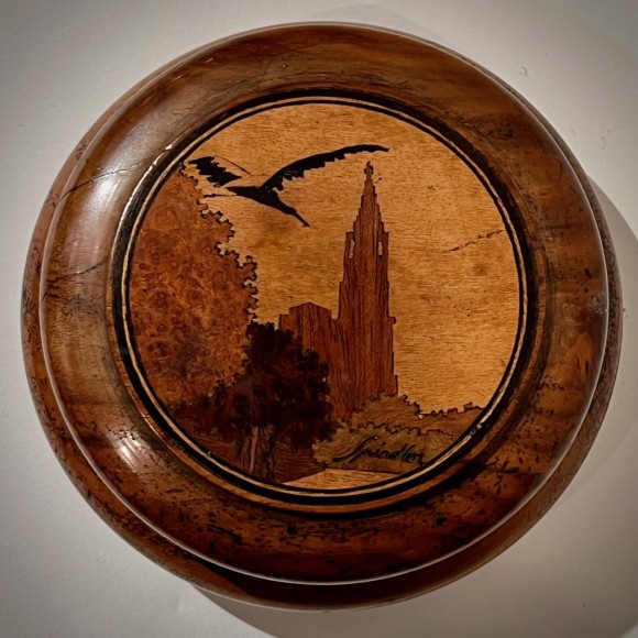 Boîte ronde en bois de noyer tourné, le couvercle s’emboîte sur le col du corps, beau décor marqueté sur le dessus du couvercle, cigogne et cathedrale de Strasbourg . Signée Spindler