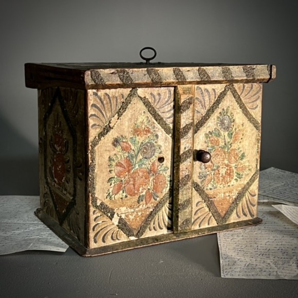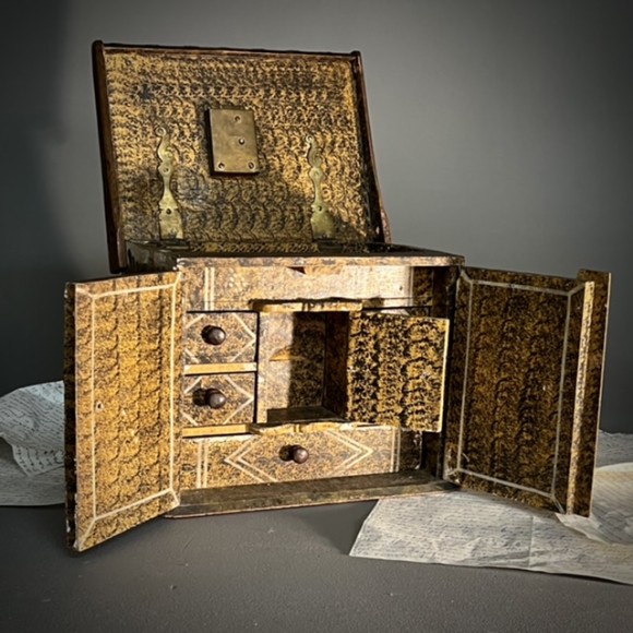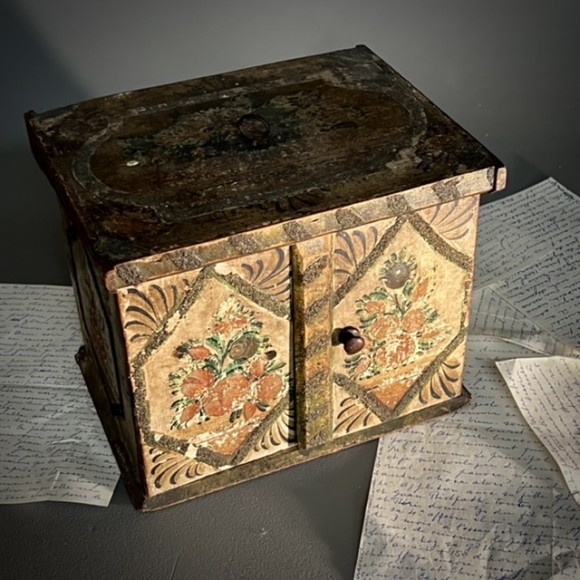 Coffret de courtoisie sur le modèle d'un petit cabinet, rare exemplaire d'art populaire, sud de l'Alsace ou Suisse , rappelons que notre ville de Mulhouse était une république indépendante sous protectorat suisse jusqu'à la fin du XVIII ème siècle et que le style du mobilier produit dans notre région se rapproche des arts décoratifs helvétiques .