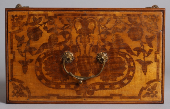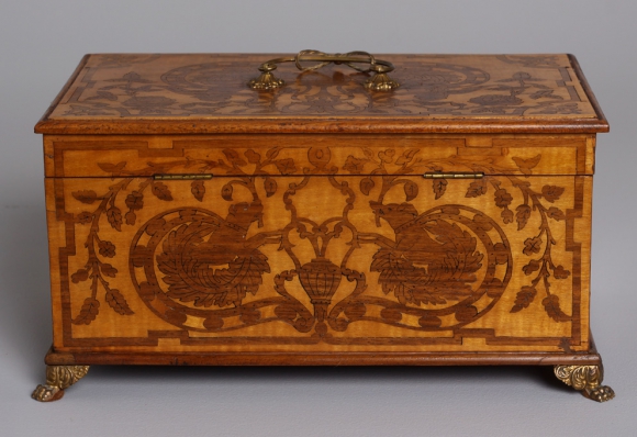 coffret marqueté d'erable et de noyer, decor d'entrelacs feuillagés, fruits , anges, chiens, petits pieds griffes et poignée en laiton ouvragé.