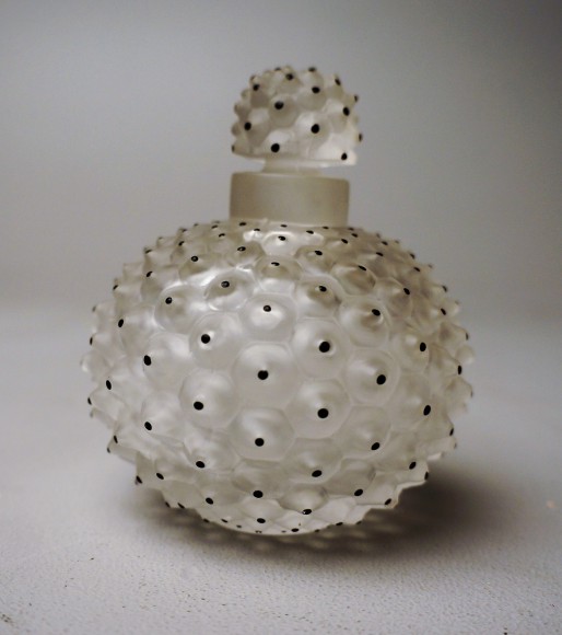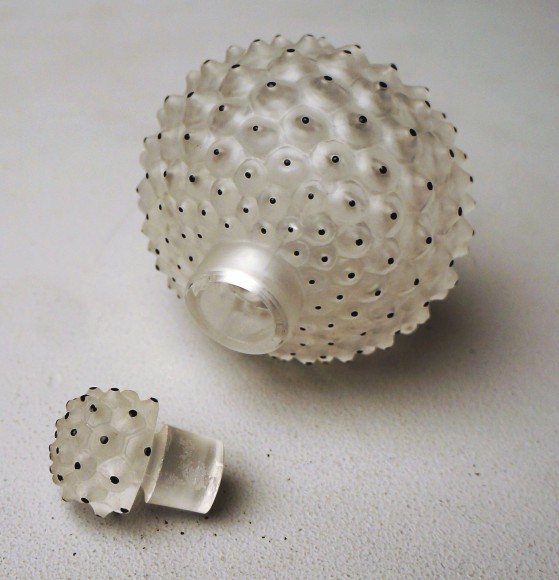 Flacon de parfum, en verre givré, dessin créé à partir de la représentation d'un oursin, corps et bouchon en bon état, signé LALIQUE FRANCE sur la base.