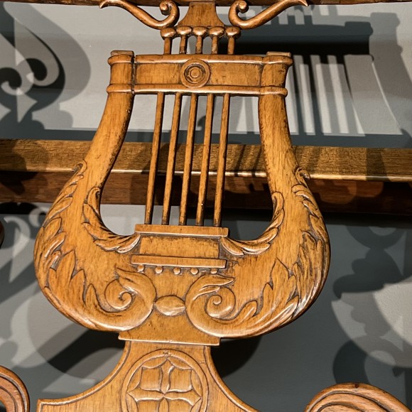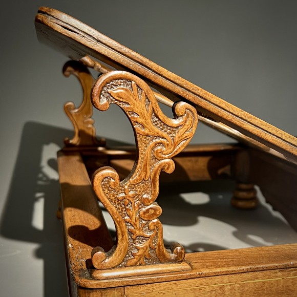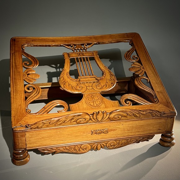 Rare modèle de lutrin en noyer sculpté, décor de volutes, lyre, rinceaux fleuris, palmettes, les plats sont incrustés de filets d'érable. Époque première moitié du XIX ème siècle.