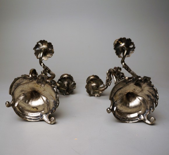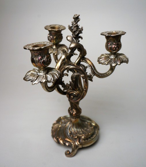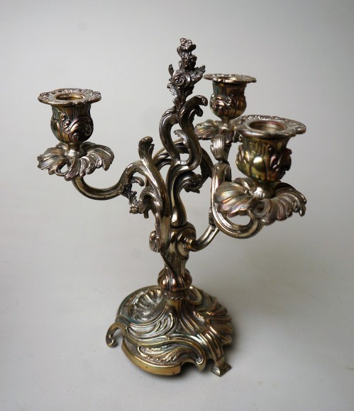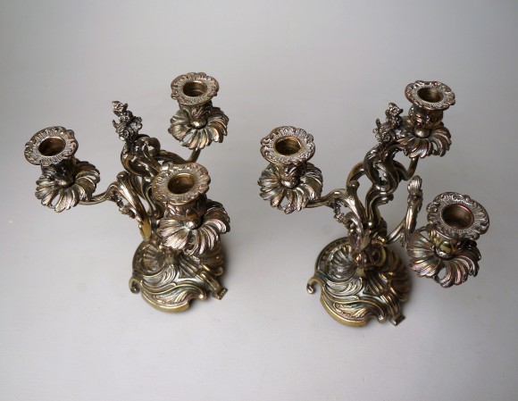 Style rocaille pour cette paire de chandeliers trois feux en bronze argenté, belle fabrication du début du XX ème siècle, proportions idéales pour dresser une table de fête.