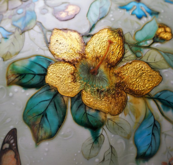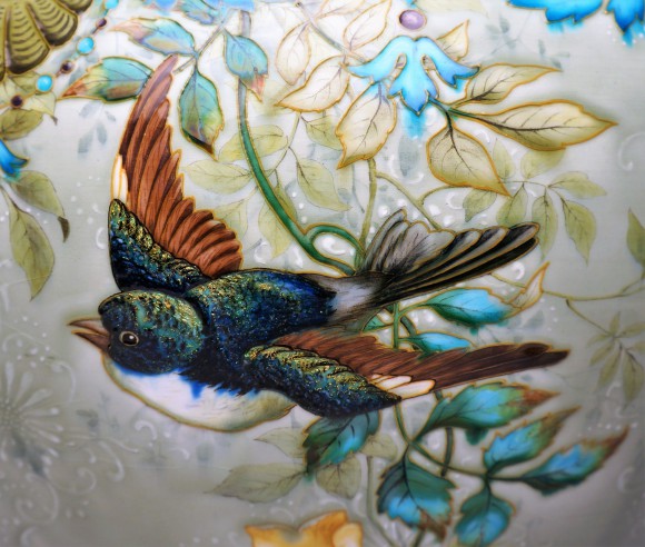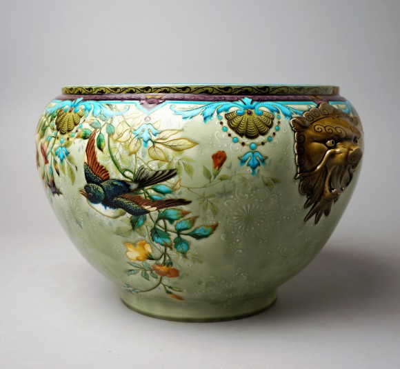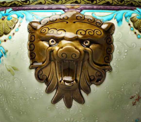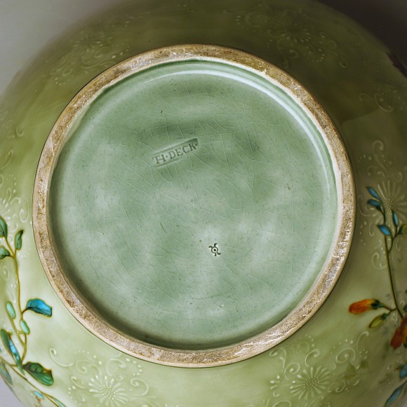 Grande Jardinière de forme ronde, le décor japonisant de branches fleuries polychrome avec des pétales aux inclusions d'or, se détache sur le fond vert céladon, ce fond présente quant à lui une frise, ton sur ton, de branchages en légers reliefs. Anses en mufle de lion. Signé TH DECK sous la base