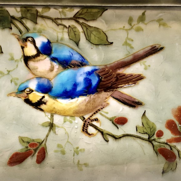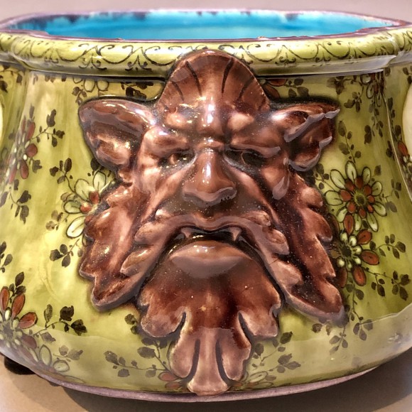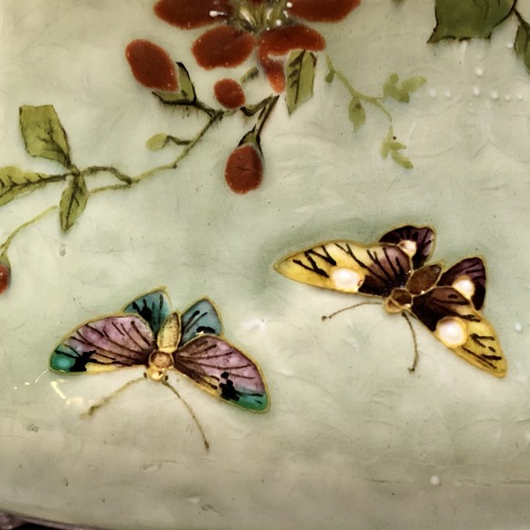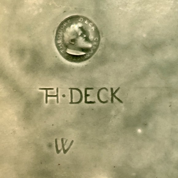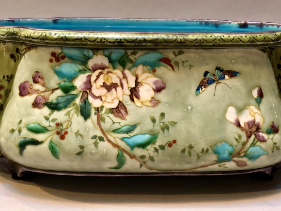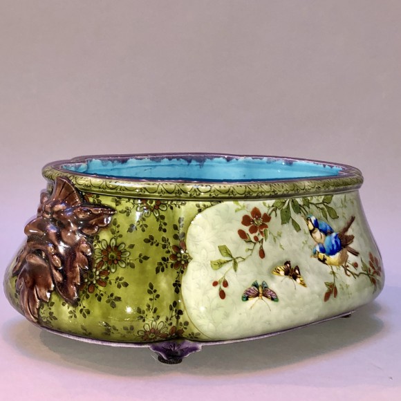 Thème japonisant pour cette jardinière en céramique de forme polylobée. Branches fleuries, oiseaux et papillons , sont la base du décor traité sur un fond céladon. Signature au tampon en creux Th.Deck.
