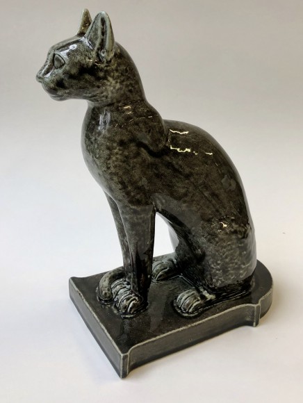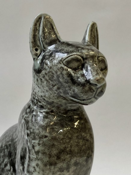 Rare représentation en céramique coloris gris moucheté du chat, modèle inspiré de la déesse Bastet, divinité importante des de l’ancienne Egypte . Pièce signée Théodore Deck en creux sous la base . Théodore Deck né en 1823 à Guebwiller en Alsace , décédé à Paris en 1891, céramiste de renommée internationale . Ses recherches sur les couleurs utilisée sur les céramiques de la Chine et de la Perse antique ont assis sa notoriété. Il mit au point le fameux « bleu Deck » et développa une série décors sur le thème du japonisme très en vogue sur la fin du XIX ème siècle. Il obtient de nombreux prix au cour de manifestations internationales sur les arts décoratifs et des médailles lors de participation aux Expositions internationales. Il fut nommé, parallèlement à son activité de céramiste, directeur de la Manufacture Nationale de Sèvres.