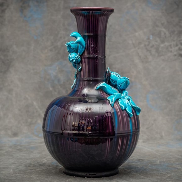 Vase en faïence émaillée aubergine, de forme balustre , décor de coloquinte et de rinceaux. Signé TH. DECK sous la base. Epoque 19 -ème siècle.
