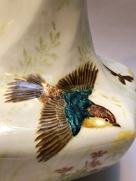 Exceptionnel vase de section hexagonale , torsadé , avec corps à facettes et col circulaire cerné d’une frise aubergine. Beau décor japonisant d’oiseaux et de papillons aux ailes chargées de reflets métalliques, or et lapis, virevoltants sur un fond céladon agrémenté d’un fond de branches fleuries. Signé en creux TH. DECK