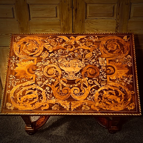 Table D’apparat Marqueterie Fleurs, Oiseaux, Chien